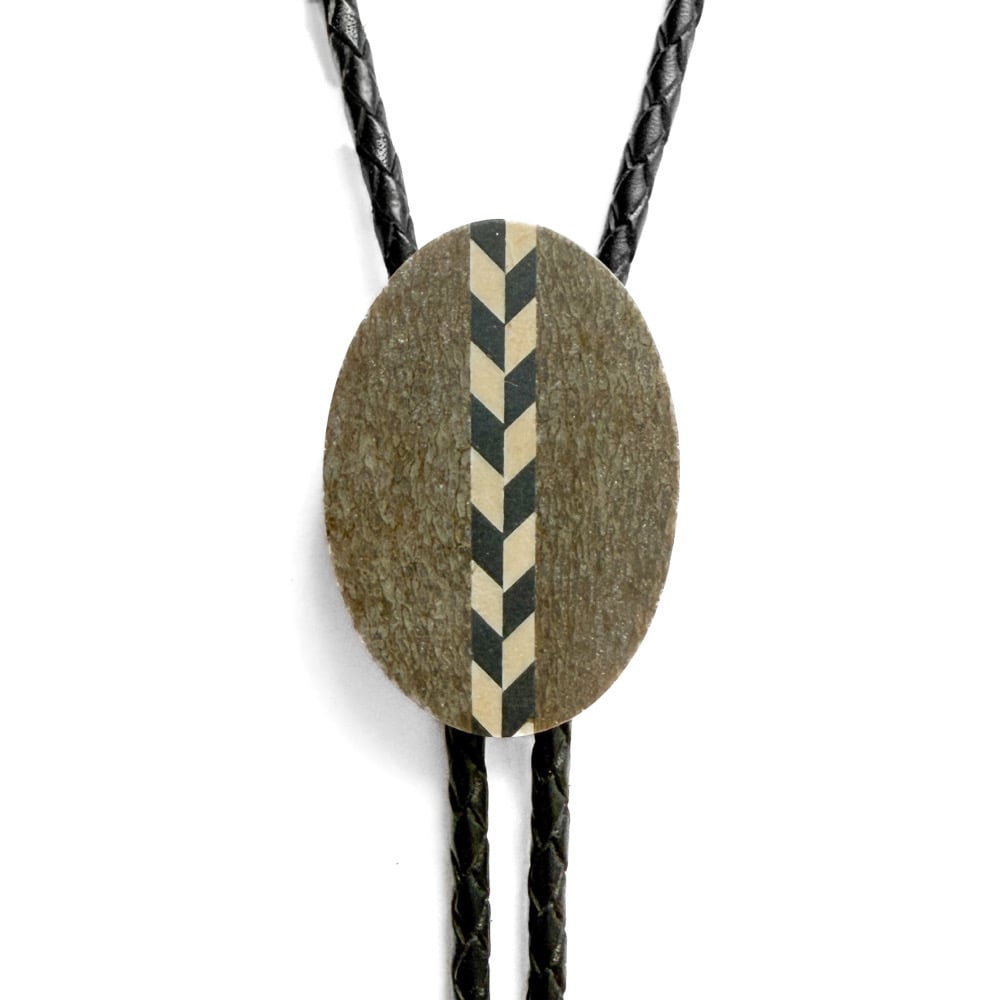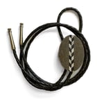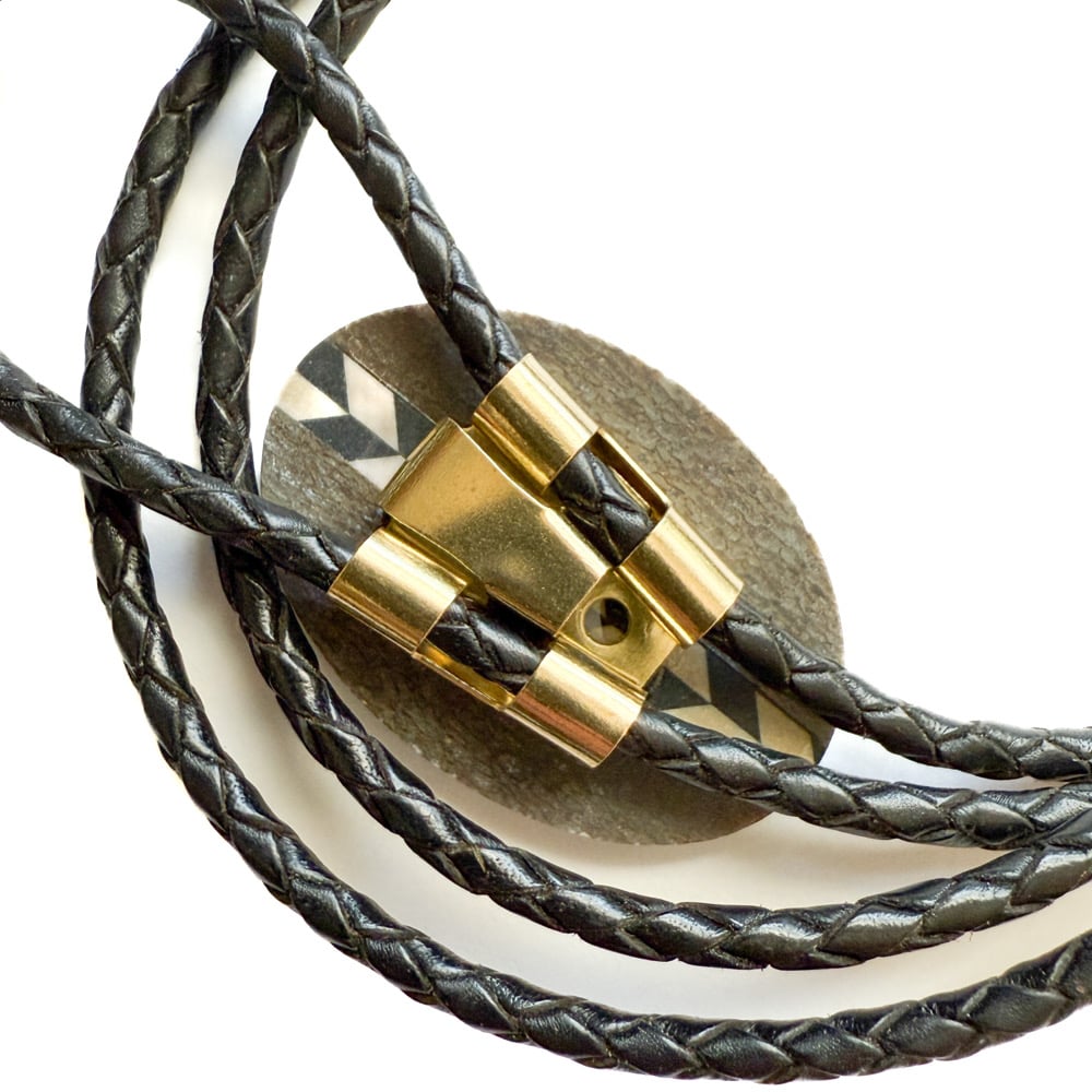 The bolo piece is 34mm wide and 50mm tall with a brass backing. The genuine leather cord is 33" long with steel tips.