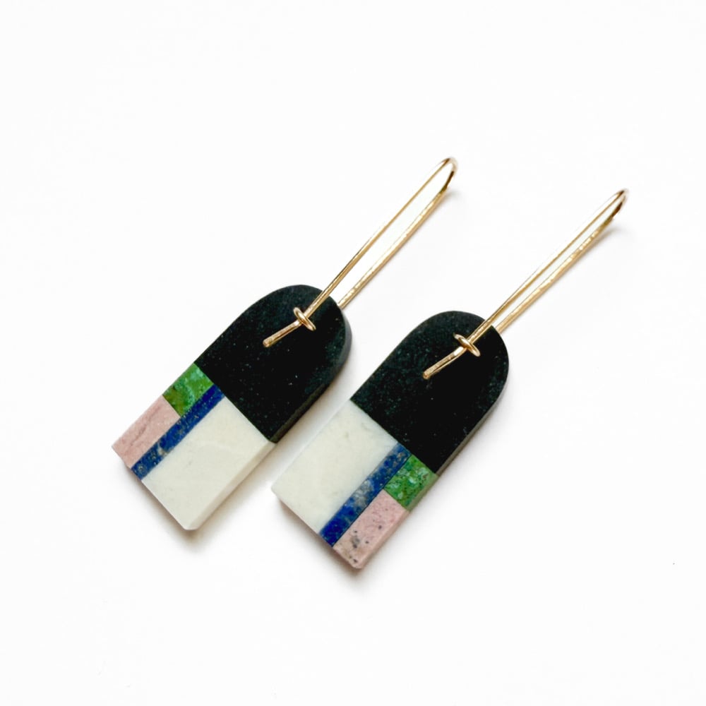These earrings are cut from billion year old Michigan basalt, white agate from Oregon, pink rhodonite from Montana, malachite from Arizona, and Lapis from Afghanistan.