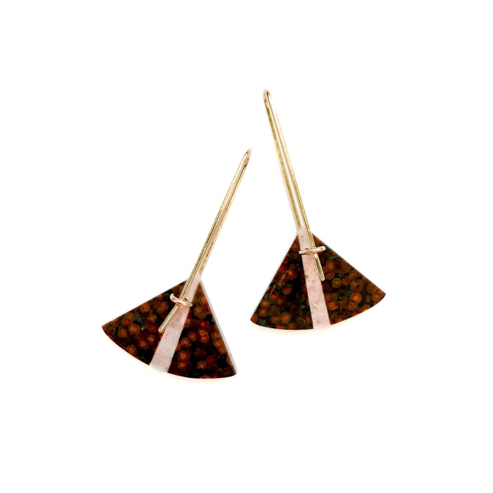 These earrings are cut from a deep red “poppy jasper” from the Olympic Peninsula and pink rhodonite from the copper mines in Butte, Montana.