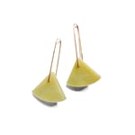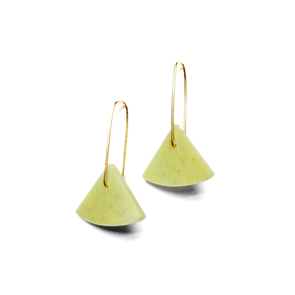 These earrings are cut from a bright yellow serpentinite from the “Verde Antique” marble quarry located at Stoddard Mountain in California's Mojave Desert. The yellow color is imparted by the presence of serpentinite. Serpentinite-marble formations are uncommon at the Earth’s surface.